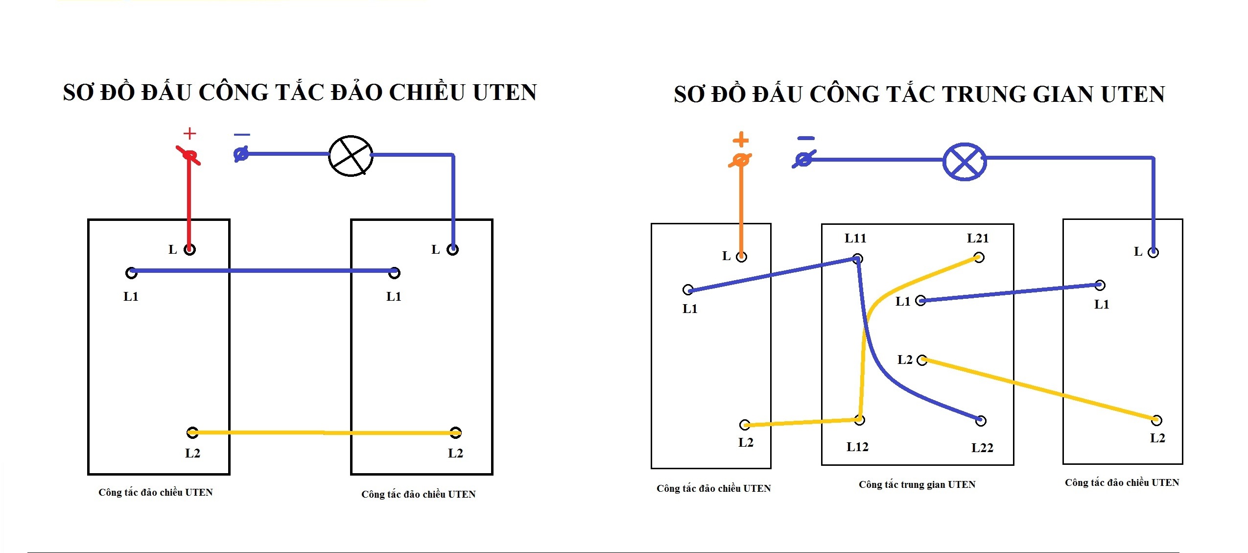 Sơ đồ đấu công tắc trung gian đế âm vuông: